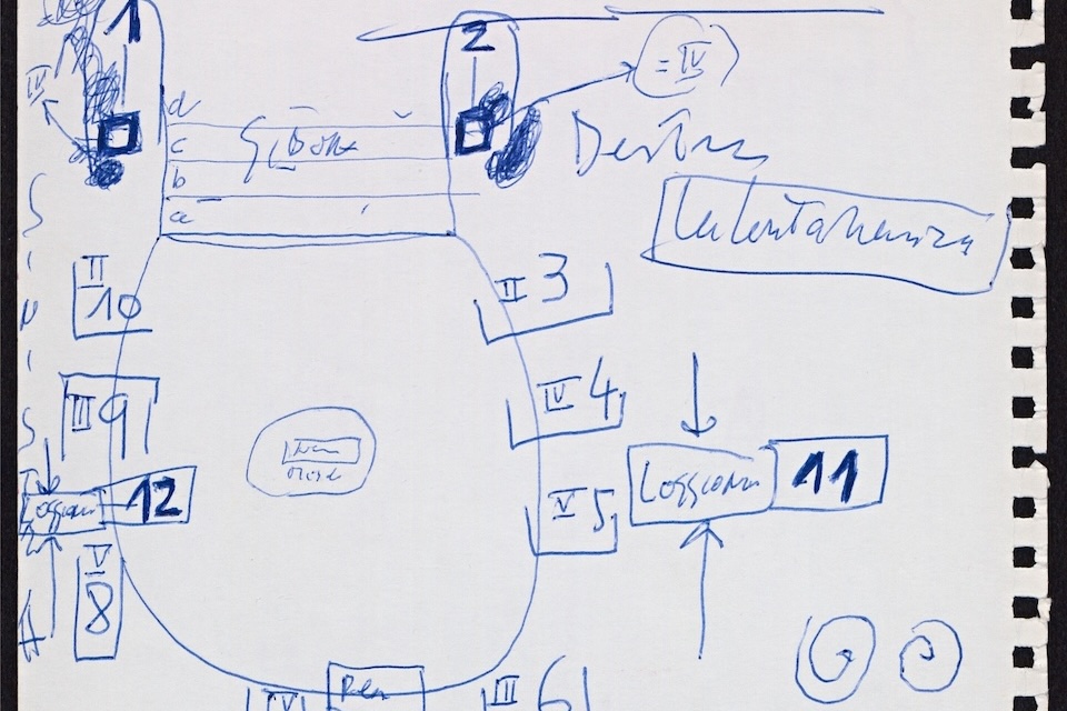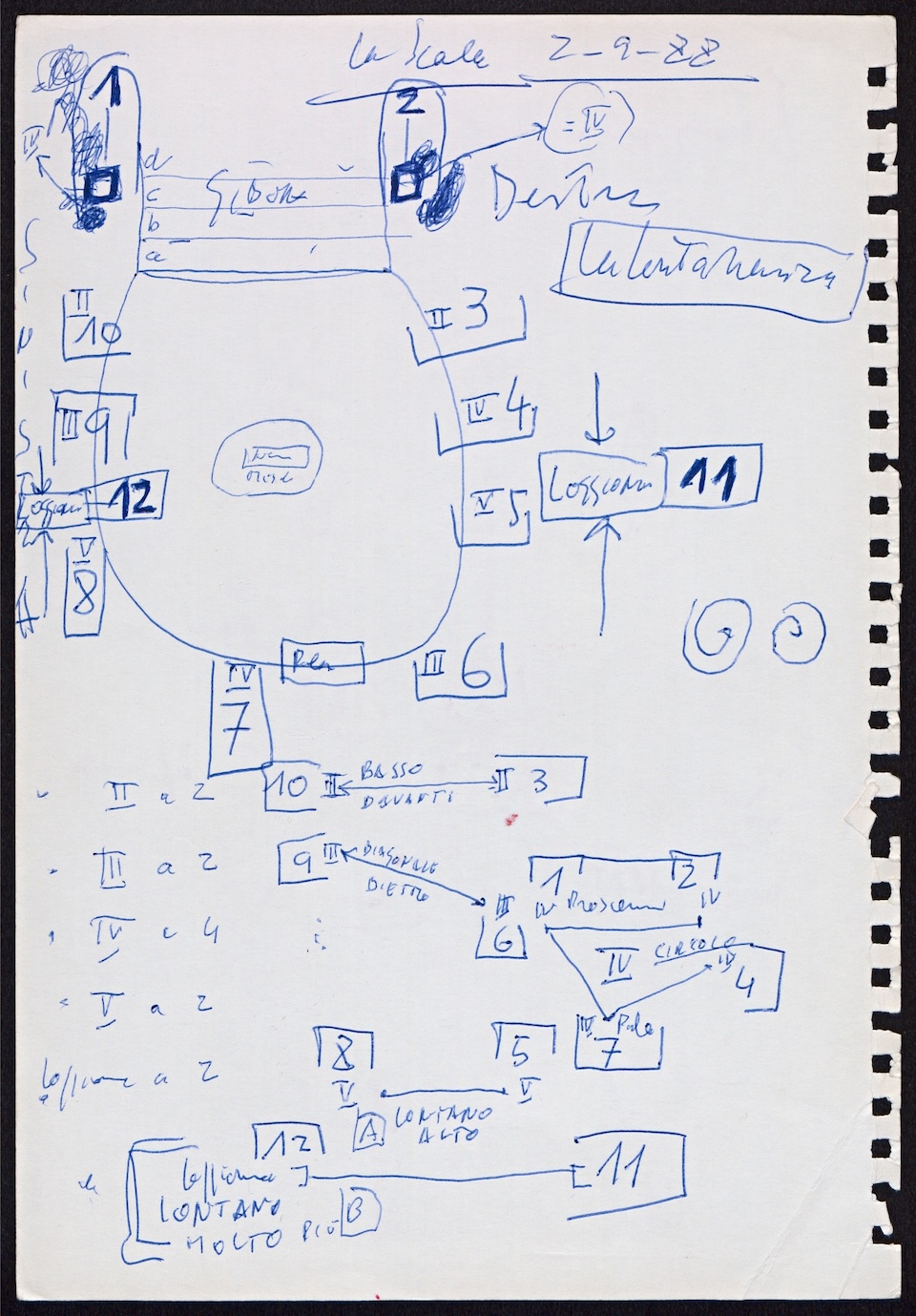 Riproduciamo qui sotto, per gentile concessione della Fondazione Archivio Luigi Nono, la pagina completa dello schizzo pensato da Nono per la prima italiana alla Scala della Lontananza nostalgica utopica futura.